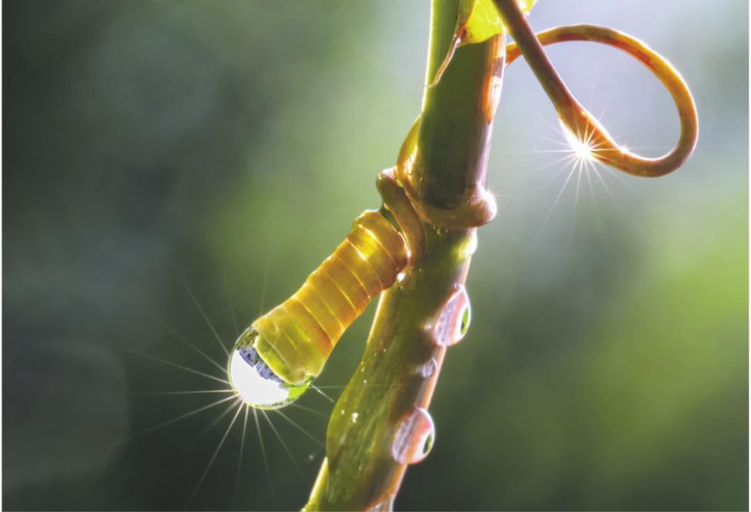 Am Sonntag ist der erste Advent. Überall werden Lichter angezündet, und an vielen Orten leuchten die Lämpchen rund ums Haus mit Solarstrom. Auf meiner Terrasse ist er gratis zu haben. Nach einem Regenguss hatte sich ein Tropfen an der Ranke der Passionsblume (Passiflora) angeheftet. Als dann die Sonne schien, sah ich schon von Weitem, wie der Tropfen nach allen Seiten glitzerte. Mit dem Makroobjektiv bewaffnet konnte ich das Strahlen der «Solarglühbirne» einfangen.