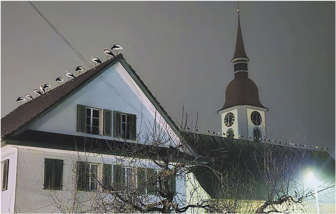 Sie sind wieder da, und es werden immer mehr. Etwa 60 Störche übernachten in Auw. Foto: Andre Kalt