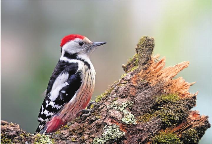 Vor zwei Wochen sass ich bei zwei Grad Celsius über vier Stunden im Wald in einem Tarnzelt und beobachtete Vögel. Ein Mittelspecht (Dendrocoptes medius) zeigte sich von seiner besten Seite. Typisch sind die rahmfarbene, rosa überhauchte und längsgestrichelte Unterseite und die rosafarbenen Unterschwanzdecken. Man findet ihn in lichtdurchfluteten Laubwäldern mit alten Eichen und Buchen. Er hat einen kurzen, recht schwachen Schnabel, den er zum Stochern braucht. Nebst Insekten und Larven spielt Baumsaft für die Ernährung des Mittelspechts eine wichtige Rolle. Mit einer langen Zunge wird dieser vom Stamm abgeleckt.