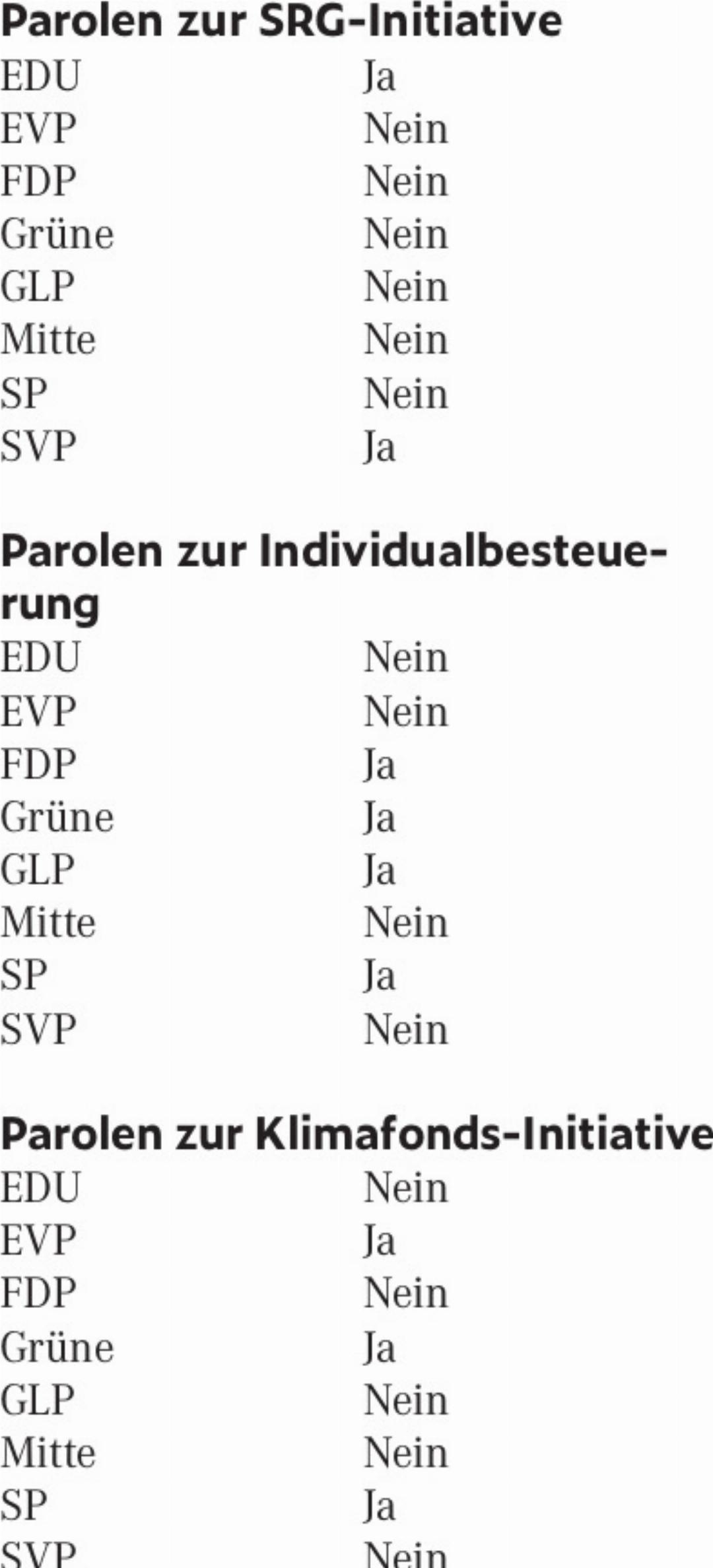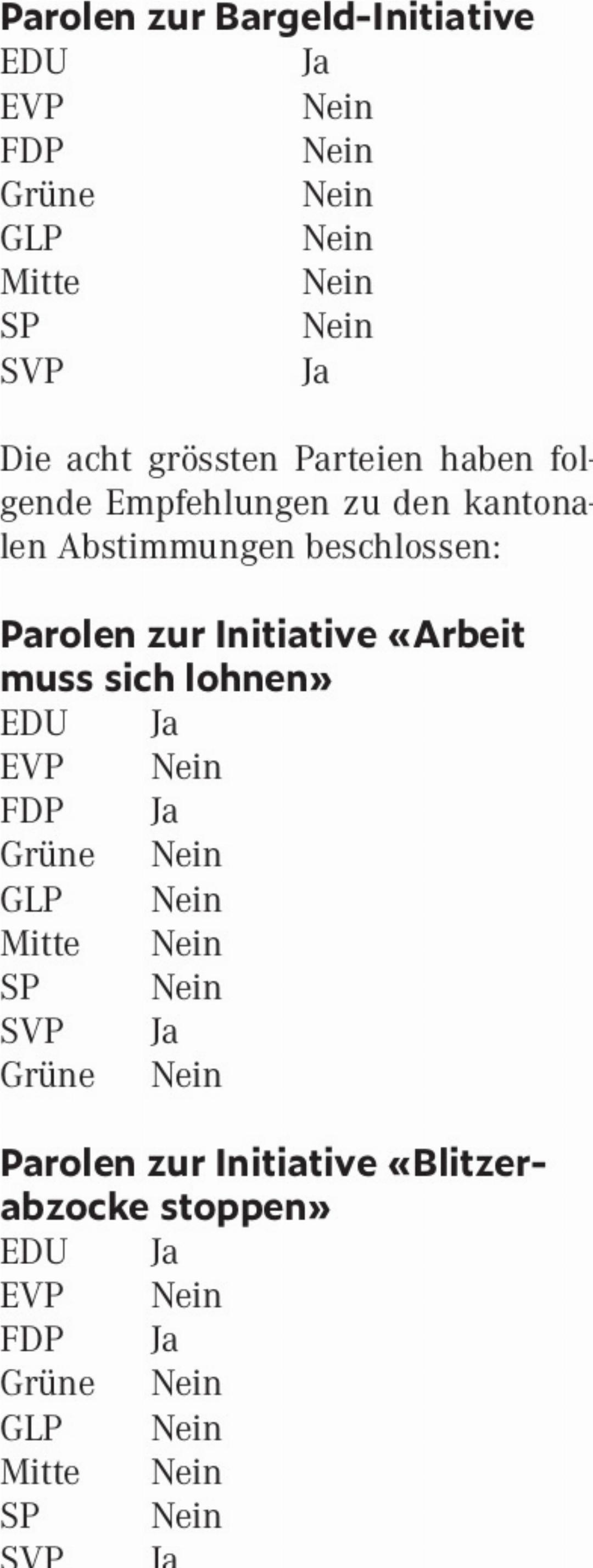 Die acht grössten Parteien haben folgende Empfehlungen zu den nationalen Abstimmungen beschlossen: