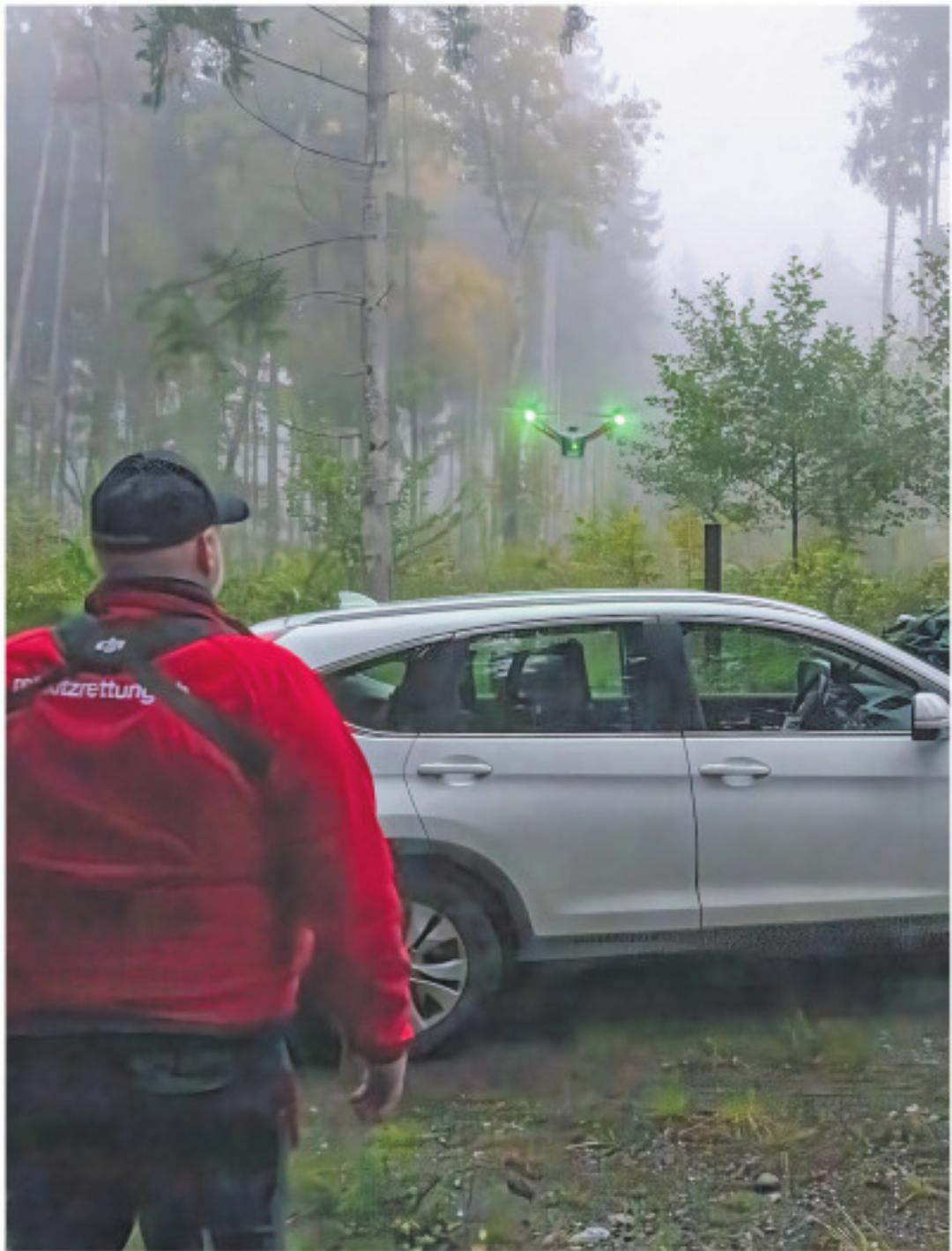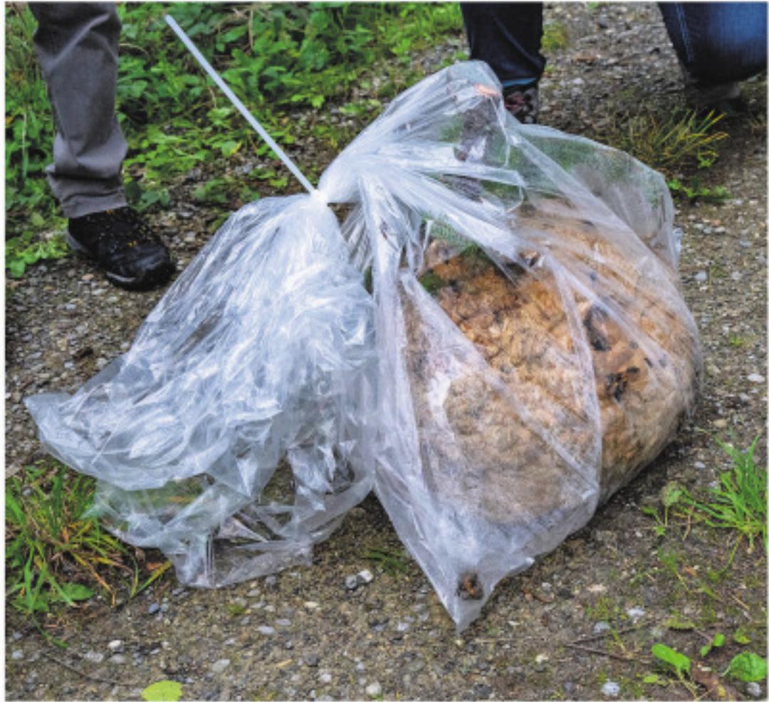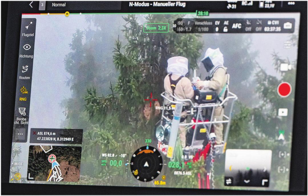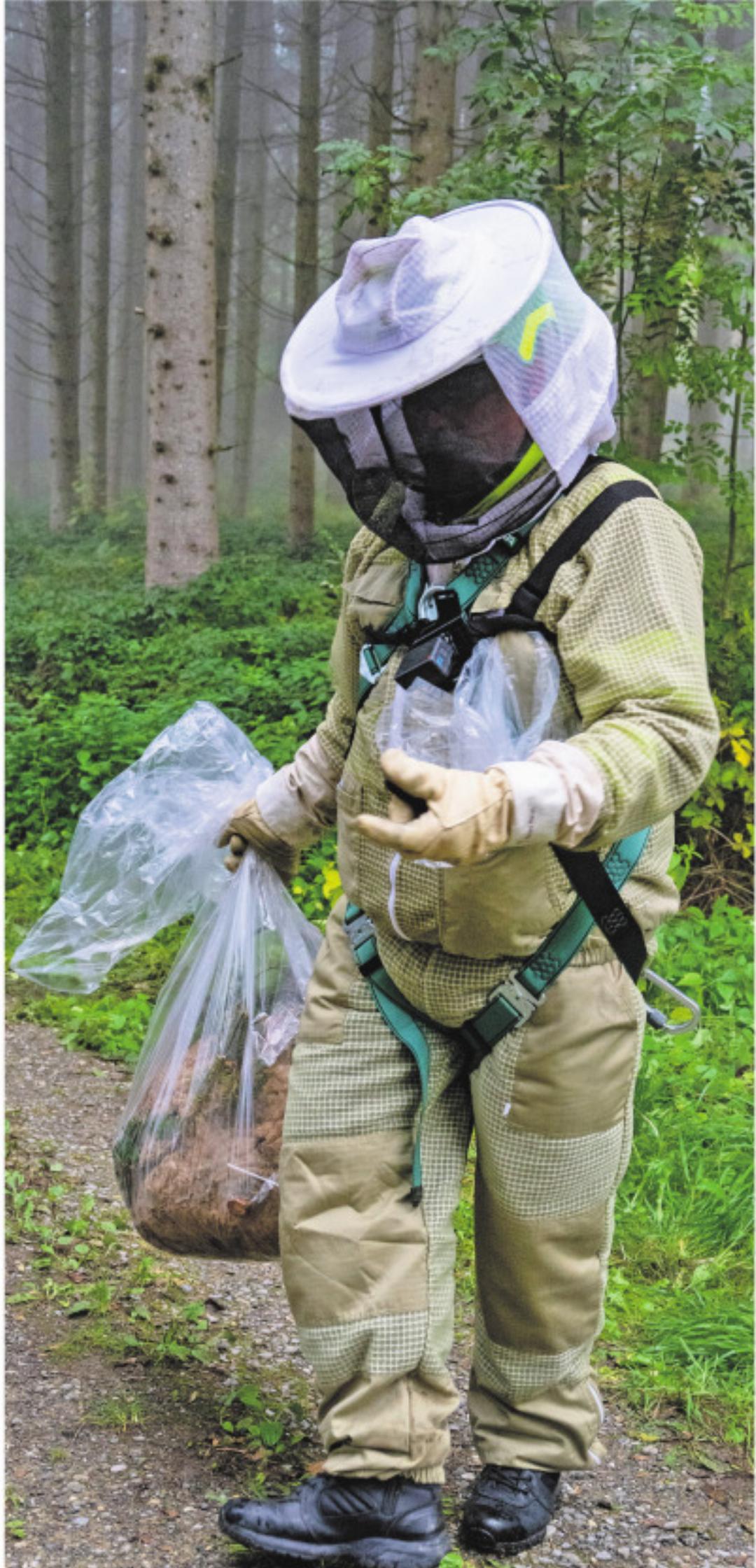 Die Aufgabe war nicht einfach. Der für solche Fälle ausgebildete Schädlingsbekämpfer Gregor Buser mit seinem Team wurde herbeigezogen, ein Teleskopstapler mit Korb, ausziehbar auf 24 Meter, in den Wald gebracht und ein günstiger Termin vereinbart. An einem frühen, nebligen Freitagmorgen standen Buser und seine Kollegen sowie interessierten Besucher bereit, unterstützt durch ein Team der Rehkitzrettung Schweiz mit Drohne und Kameras. Da die Asiatische Hornisse nur tagsüber aktiv ist, war die Wahrscheinlichkeit gross, das Nest samt den Tieren einpacken zu können. Dicke und doppelte Schutzanzüge für die Akteure waren unumgänglich, und sämtliche Mitbeteiligten beobachteten den Einsatz aus sicherer Distanz. Denn bei Gefahr werden diese Insekten sehr aggressiv. Das kantonale Waldgesetz verbietet den Einsatz chemischer Mittel, so musste auf CO2 zurück gegriffen werden, um die Tiere zu betäuben.