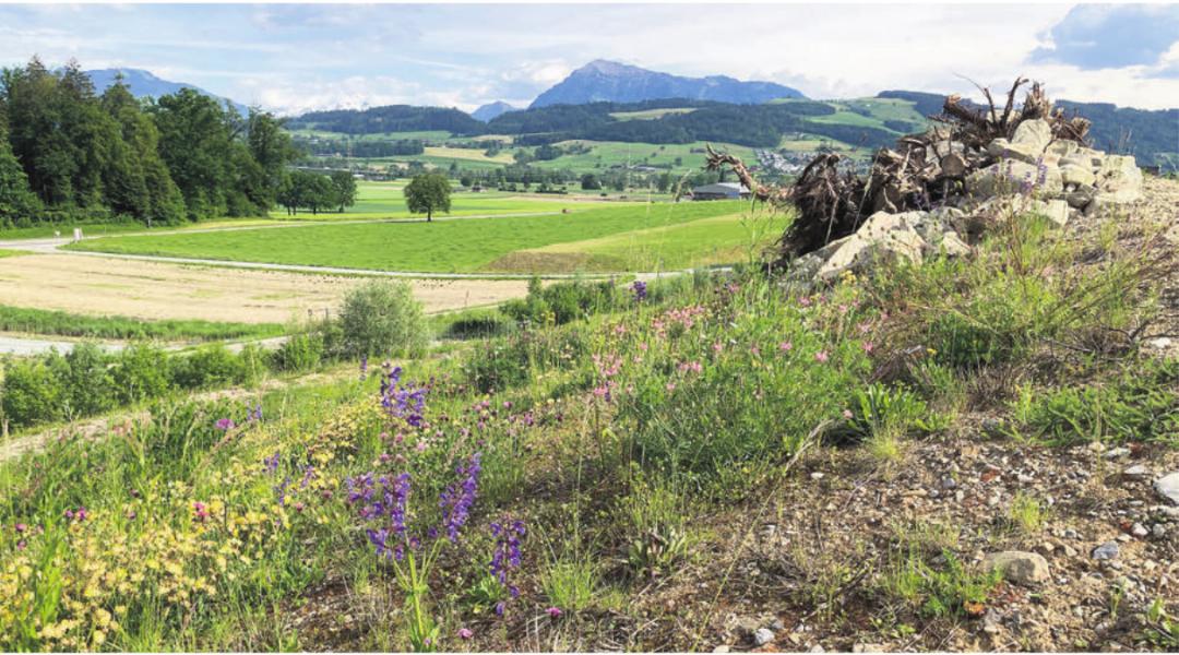 Die naturnahen Flächen um den Installationsplatz sowie die Böschungen wurden im Sommer 2025 durch eine Fachperson auf Neophyten kontrolliert. Unerwünschte Pflanzen wurden entfernt und ein Säuberungsschnitt durchgeführt. Ein erster Teil der Ostböschung wurde bereits 2022 erstellt und begrünt. Die Bepflanzung hat sich schon sehr gut entwickelt. Insgesamt sind rund 15’000 m2 ökologische Ausgleichsfläche definitiv erstellt. Zusätzlich bestehen rund 3’500 m2 temporäre naturnahe Flächen.