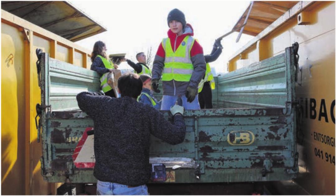 Auf dem Kiesplatz hinter dem Mehrzweckgebäude standen zwei grosse, gelbe Container. In den einen sollte das Papier, in den anderen der Karton. In drei Gruppen aufgeteilt, gingen die Schüler mit ihrer Lehrperson ans Werk. Zwei Traktoren und drei Anhänger standen bereit. Zwei Gruppen verteilten sich zu den Traktoren mit den leeren Anhängern, und ab ging die Tour. Die dritte Gruppe Kinder begann, den bereits gefüllten dritten Anhänger leerzuräumen.