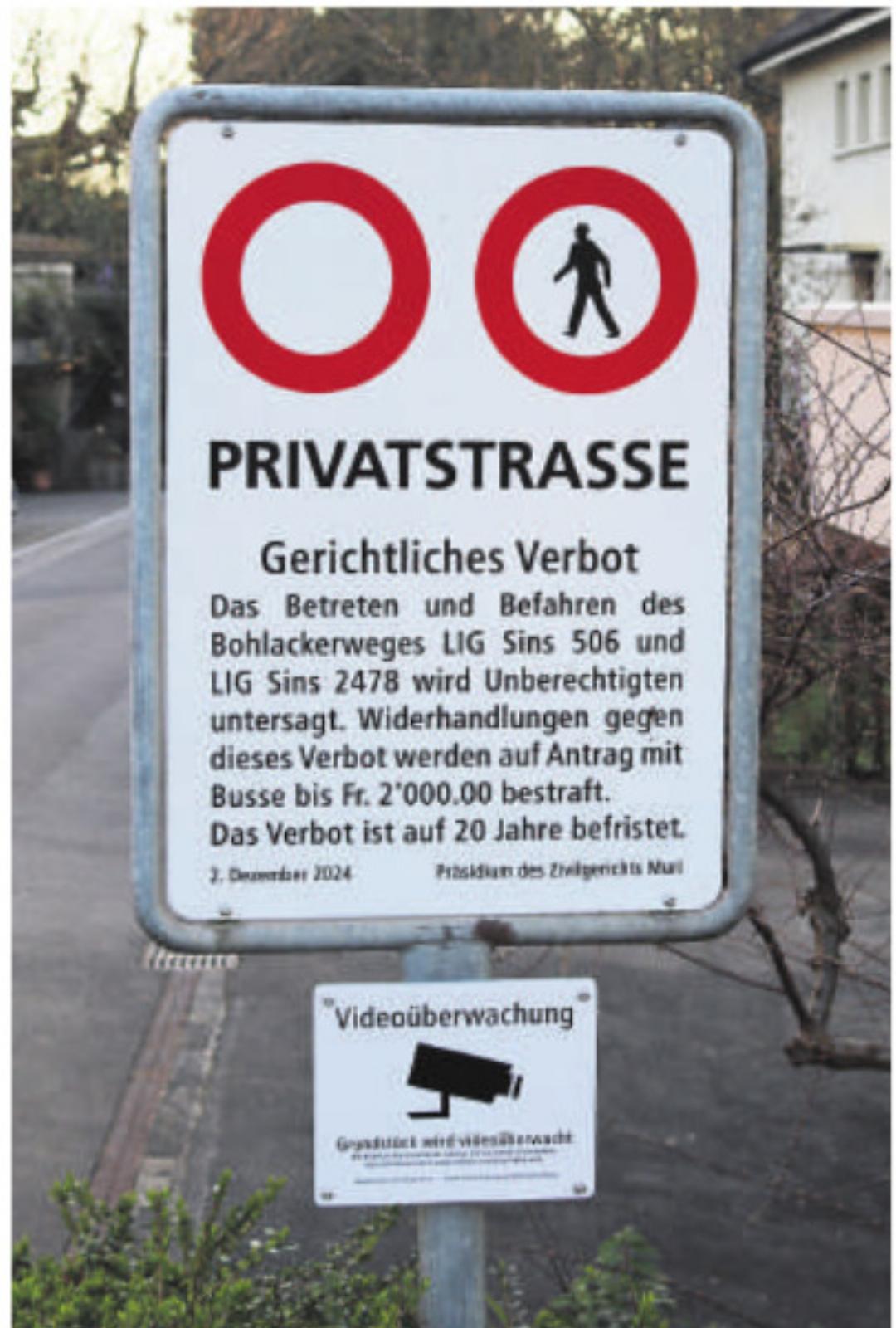 Auf den Tafeln, die an den drei Einmündungen platziert sind, steht klar und deutlich: «Das Betreten und Befahren des Bohlackerwegs LIG Sins 506 und LIG Sins 2478 wird Unberechtigten untersagt. Widerhandlungen gegen dieses Verbot werden auf Antrag mit Busse bis 2’000 Franken bestraft. Das Verbot ist auf 20 Jahre befristet.»