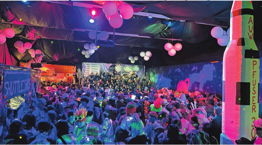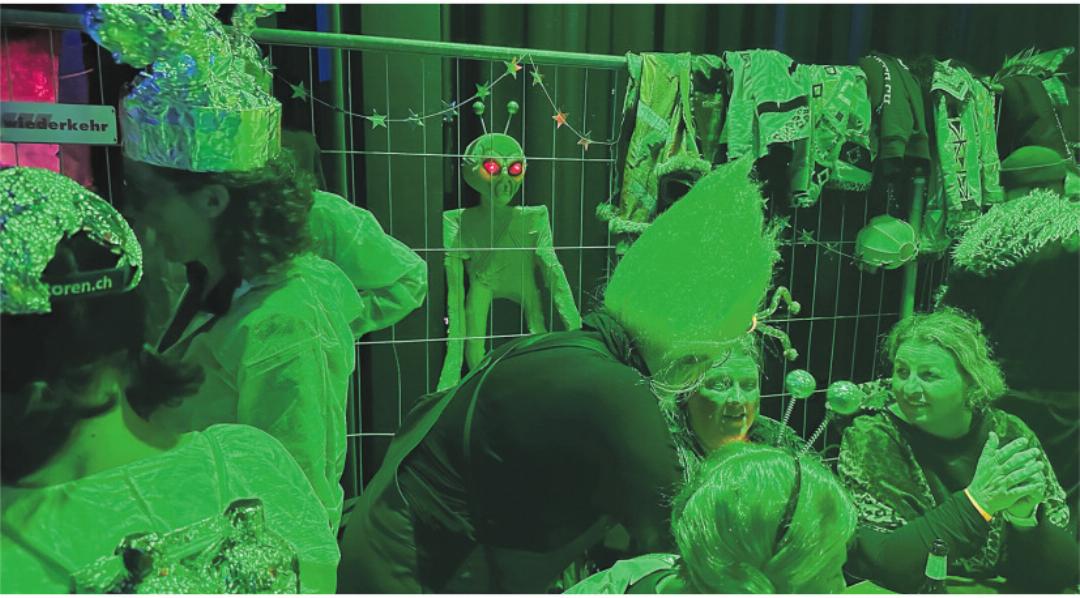Auch «Major Tom», der bekannte Song von Peter Schilling aus dem Jahr 1982, fehlte nicht. Dieser alte Ohrwurm liess die Menge mitsingen. Glitzeranzüge, Alufoliengebilde, Leuchtwesten und eine ausserirdisch gute Stimmung prägten das Bild des Freitagabends in und um die Mehrzweckhalle in Auw. Das unerschöpfliche Thema «Ab ins All» entlockte den eingefleischten Fasnachtsfans eine gigantische Vielfalt an Sujets für gelungene Masken. Fantasievolles gab’s zu sehen, so weit das Auge reichte: eben erst gelandete Astronauten von irgendwo, eine Putzkolonne, die den Weltraumschrott einsammelte, Marsianer mit üppigen Frisuren und vieles mehr.