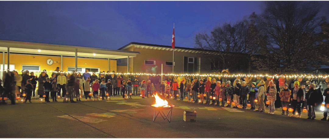 Die Schülerinnen und Schüler zogen mit ihren liebevoll geschnitzten und leuchtenden Räben oder ihren selbst gebastelten Laternen eine Runde über den Schulhausplatz. Anschliessend wurden die leuchtenden Kunstwerke an einer langen Leine aufgehängt, sodass sie in der Dunkelheit wunderbar zur Geltung kamen.