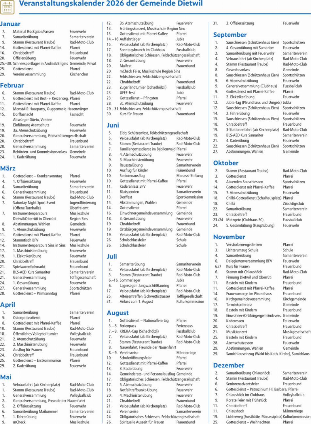 Veranstaltungskalender 2026 der Gemeinde Dietwil
