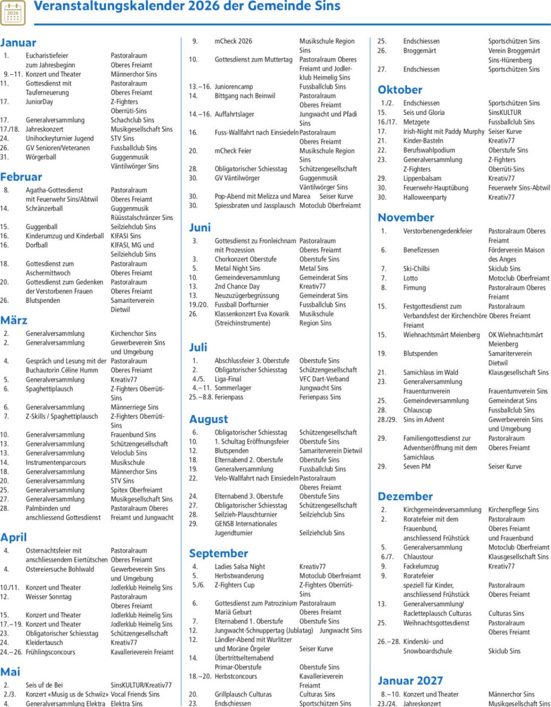 Veranstaltungskalender 2026 der Gemeinde Sins
