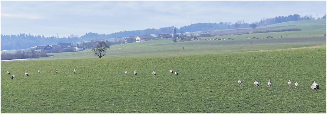 Prägnant, mit seinen breiten schwarzweissen Schwingen, die eine Spannweite von bis zu zwei Meter haben können, dem schlanken roten Schnabel und den langen staksigen roten Beinen, ist der Weissstorch aktuell in der Region viel gesehen. Ganze Kolonien bevölkern momentan die Wiesen zwischen Auw und Alikon. Die eher milderen Winter der letzten Jahre haben dazu geführt, dass die Tiere nicht mehr unbedingt in den Süden ziehen müssen, um zu überwintern.